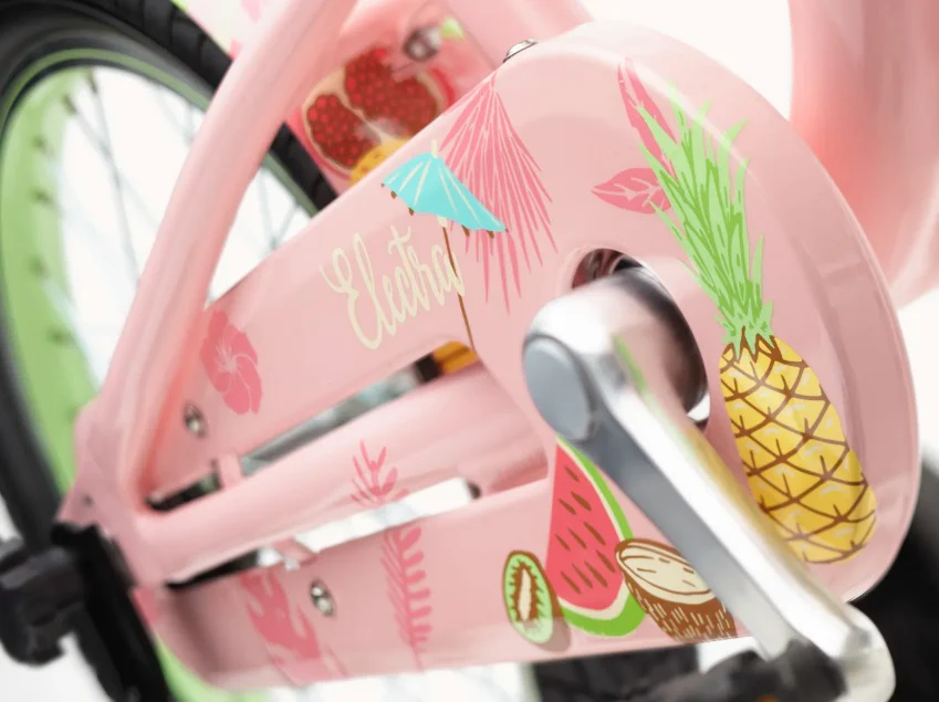 It's summer every day on the Electra Tutti Frutti 16" Kid's Bike. Fresh, tropical fruit and popsicles adorn the Pink Lemonade frame while palms and flowers lay waiting to be picked up by a sea breeze. The playful design of the Electra Tutti Frutti 16" Kid's Bike is carried throughout the fenders, chainguard and custom saddle, bringing the joy of summertime to every two-wheeled adventure!